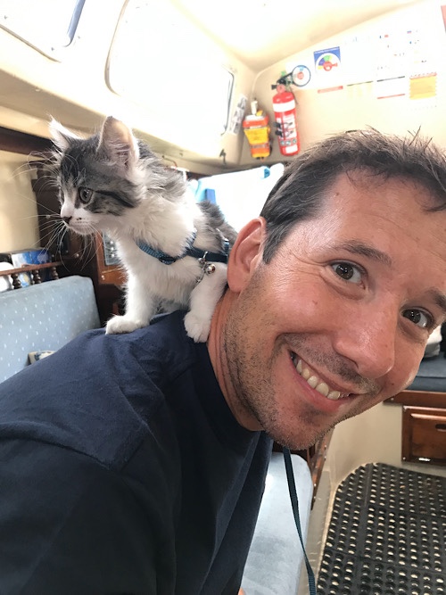 Derrick has a boat. We met up with Amy and her partner, Matt, and Amy’s wee kitten, Macaroni, and headed round to the yacht club to join Derrick (Amy’s dad) on his 32ft sailing boat. He’s had it for a couple of years, and has refitted it with loving care, teaching himself to sail. We headed out into the bay, and Derrick had me and Shona manhandling the boat in the 20 knot winds around the bay for a few hours. It was absolutely brilliant fun. I’m not sure that Macaroni (whose first time at sea was often at 45º angles, as we caught full sail and skimmed along), enjoyed it quite as much, but a ship’s cat she will make, aaaarrr.