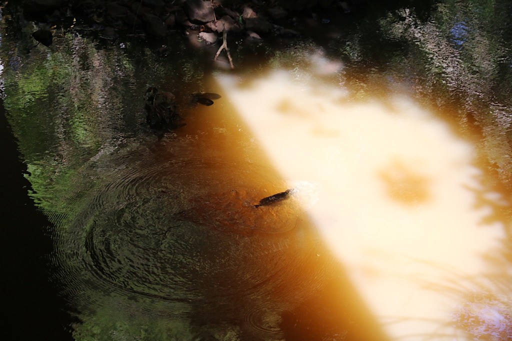 Turning inland, avoiding Cairns, we headed up into the hills to the Atherton Tablelands. The environment changed from dense rainforest to rolling hills, interspersed with farms and coffee plantations. This route was beautiful to drive. We stopped at a viewing spot to try and see the elusive Duck-Billed Platypus (another unlikely creature). We sat for ages under a bridge like a couple of trolls, spying their bubbles but failing to spot one coming up for air. It was only later that evening when I checked the photos that I clocked this: