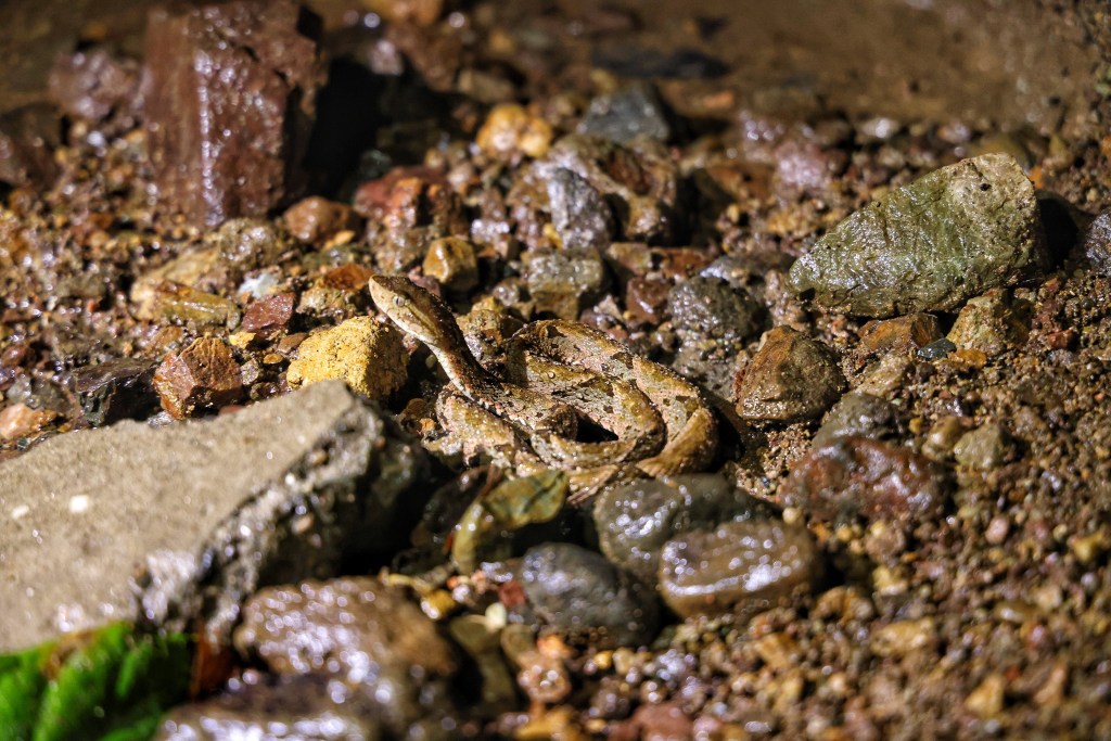 We’re given gumboots, and wade into a small, fast-flowing river. The boots hold up for about 5 minutes before they’re flooded by deeper sections of water. It’s warm though, and it’s raining again so nobody cares. The jungle is loud. A chorus of cicadas and frogs accompany us. José asks us to hold back as we round a small bend in the river. He said he’d spotted a viper here recently so we should take care where we tread. Sure enough, just round the bend, a small head pokes up from the river bank – a Fer-de-lance viper. Very poisonous, and not in any way fussed by us.