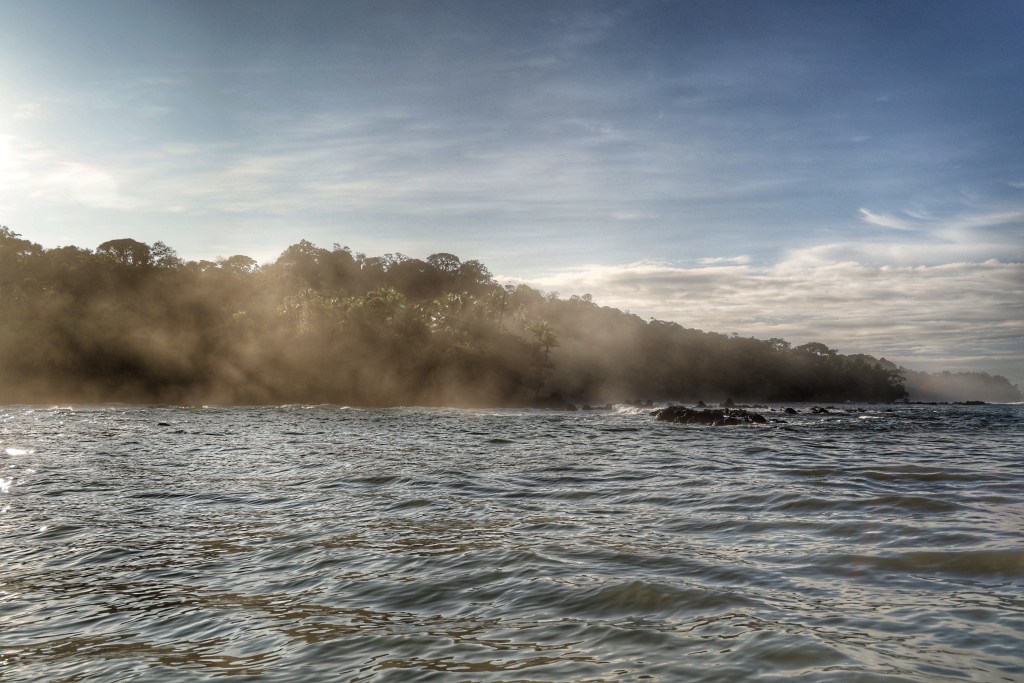 After 4 hours, and some interesting driving, we reach Sierpe, a tiny town by the banks of the Rio Sierpe. We load our luggage into an open-topped fiberglass boat, and along with other visitors and locals, head out along the eponymous river, snaking its way towards the Pacific. The captain clearly enjoys this trip; twin 300hp engines blast us along, banking hard around the twisting turns of the river; passing basking crocodiles en route. As we emerge from the mouth of the river, we need to get past a ring of breakers forming a natural barrier to the ocean. Riding the cresting waves, the captain times this well, but it’s a bumpy ride. Once clear, we head along the coast until we reach Bahia Drake – Drake Bay.