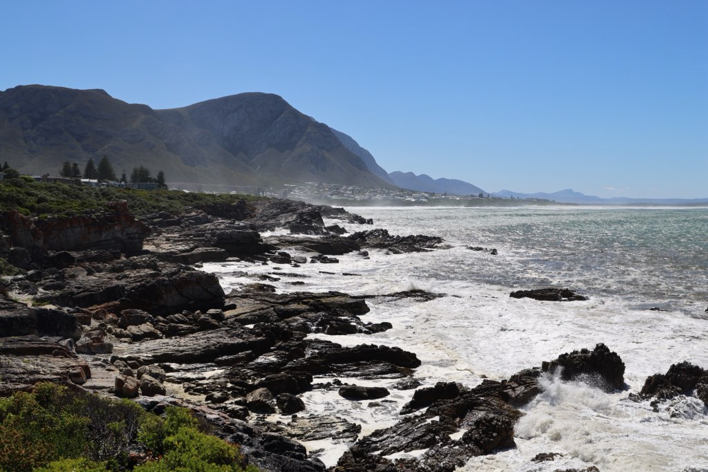 In the afternoon, we drove for several hours to reach Hermanus, our stop for the next two nights. Hermanus is famous for two things, whales and Great White Sharks. It’s situated at the edge of a large bay, itself made up of several smaller bays. A glorious rugged coastline receives a constant barrage of waves, enhanced while we were here by a strong wind, creating a magical display.