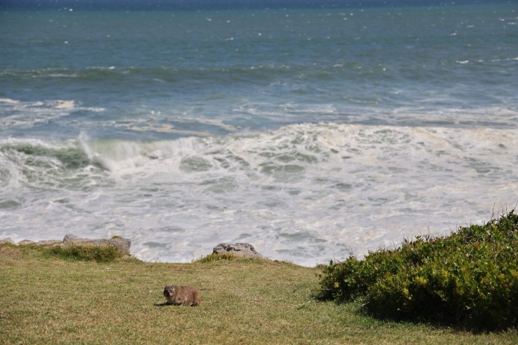 We continued around the coast, scaring a Cape Gray Mongoose (too quick for a photo), and met a few Dassie Rats (which are not rat-like and are rather cute). Ending up at the end of the path on a huge expanse of beach. The wind was fierce and we took a sand-blasting before turning around and heading back to Hermanus.