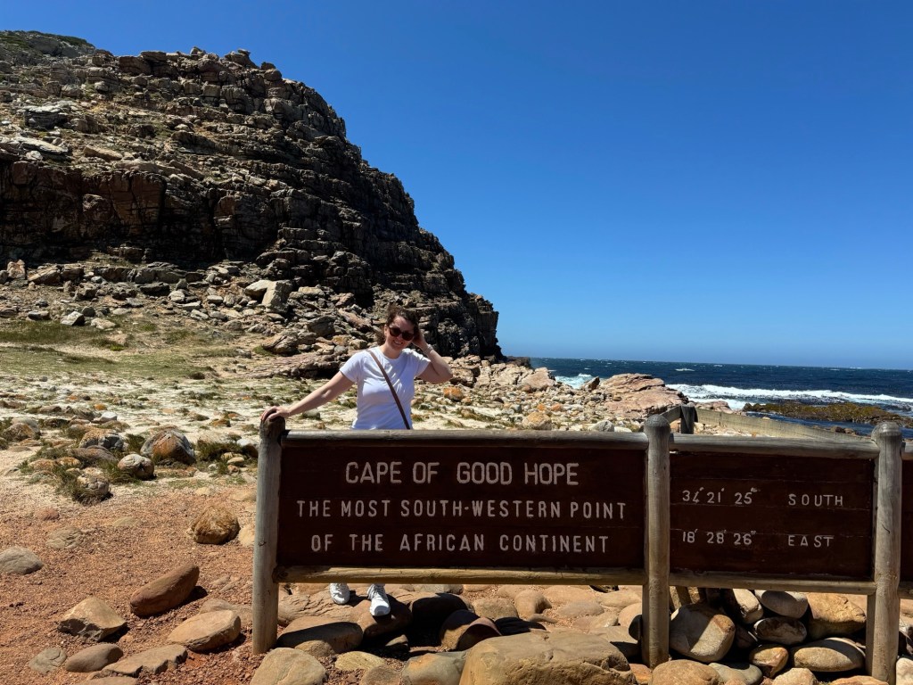 After Penguins (yes, we saw all of the Penguins. African or ‘Cape’ Penguins, to be precise), we drove as far south as we could, down to the place of childhood lore; the Cape of Good Hope. This peninsular is not the most southerly point in Africa, despite what Geography teachers might have told you (or you’d mis-remembered Geography teachers telling you). Don’t worry though, Shona is here to correct you, and point out that it’s the most South Westerly point in Africa, the point at which the Atlantic and Indian oceans meet.